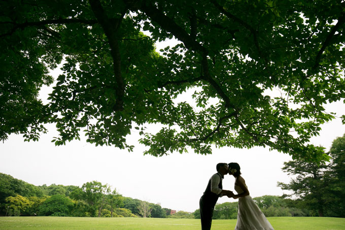斜めに入ったスカートのデザインがすらりとした印象を与え、大人の花嫁に着こなしていただきたい一着です。沖縄の自然がいっぱいの公園の中で、凛とした雰囲気をまとえるスタイリッシュなウェディングドレスです。